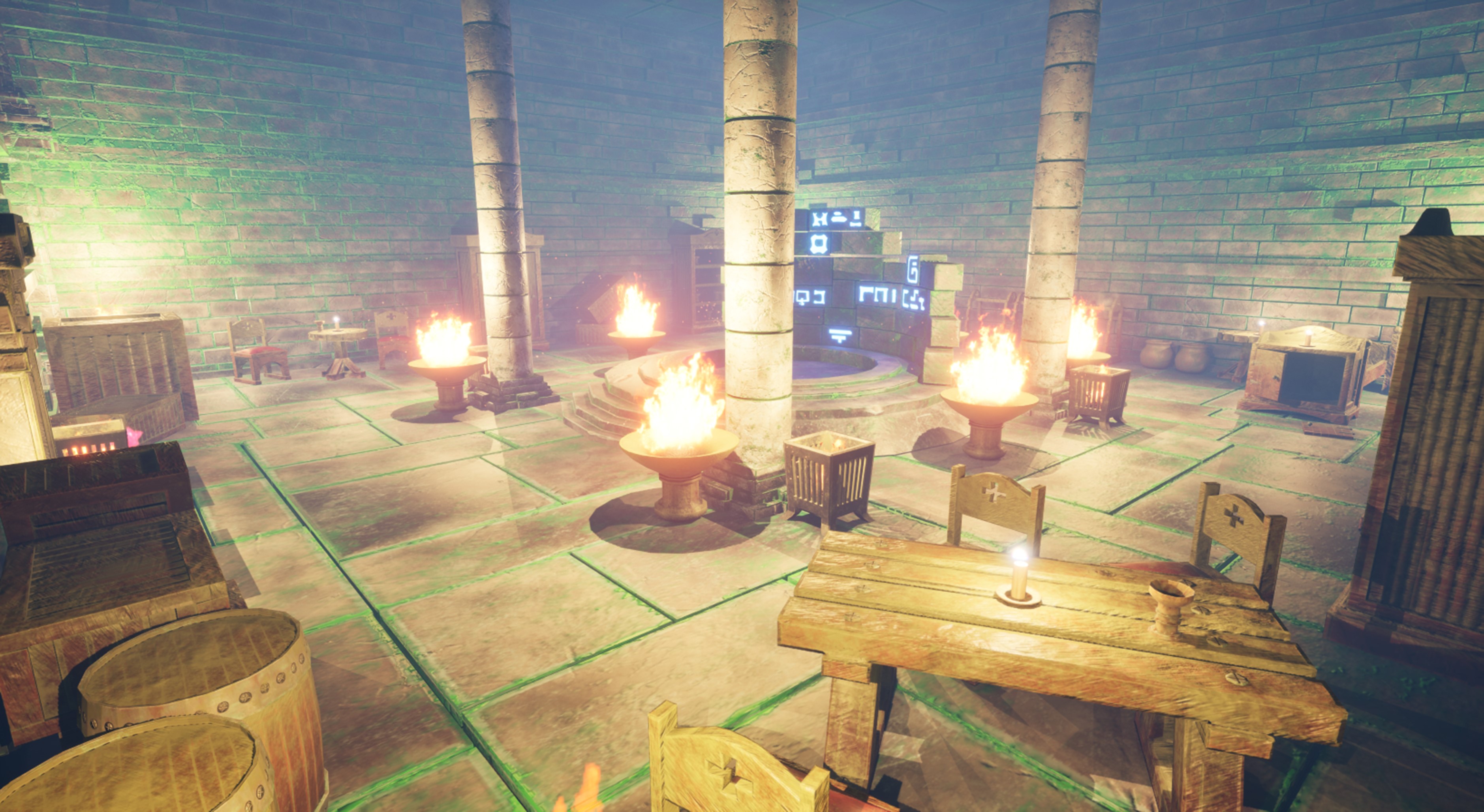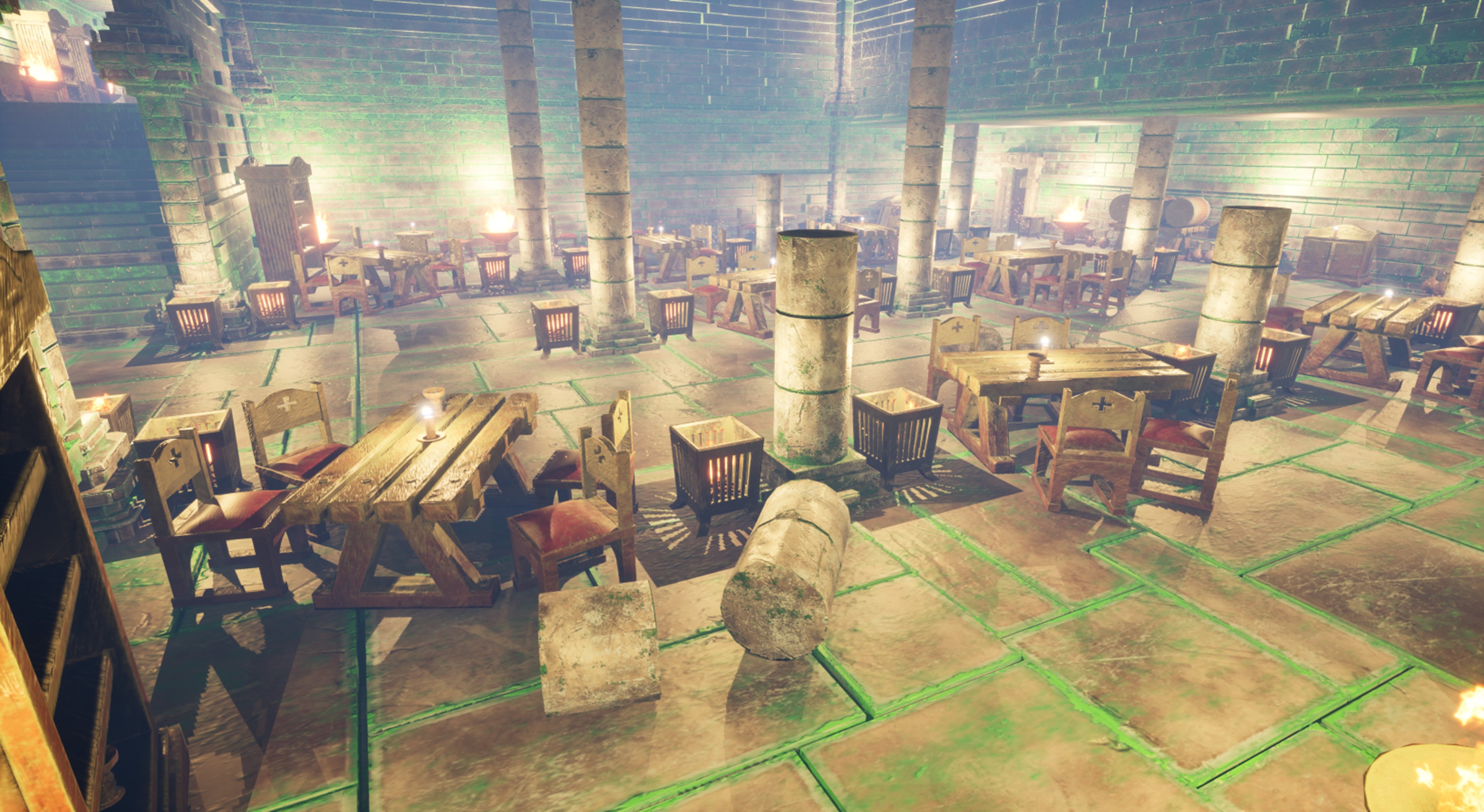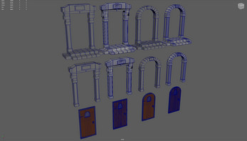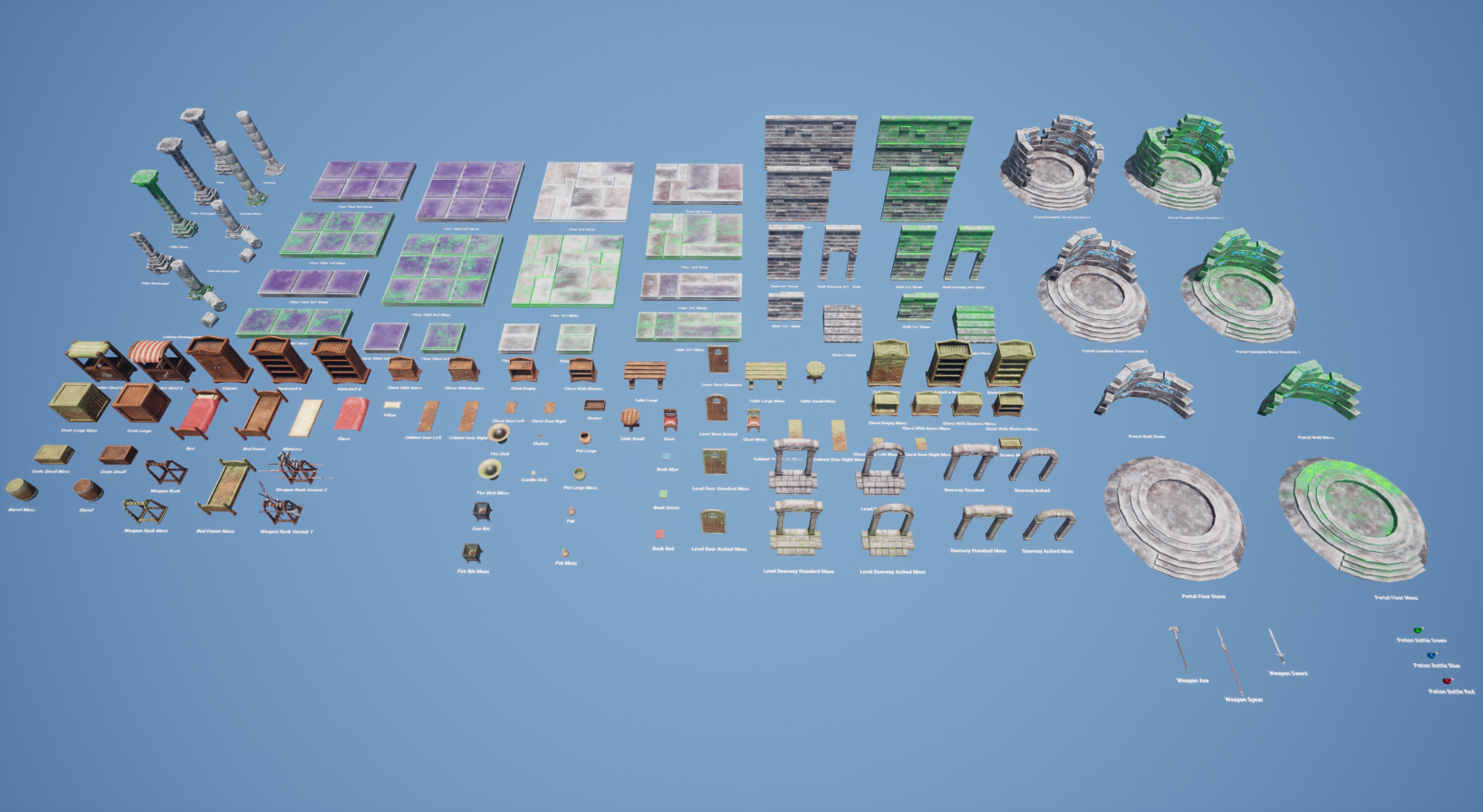 Consists of a variety of pieces such as floor, wall, weapons, portals, columns, furniture, market stools and door pieces, many of which come with a moss textured variant as well.
